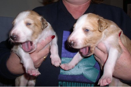 The babies now have their eyes open. They’re starting to toddle unsteadily around the whelping box (actually a kid’s paddle pool), growl and tussle (or at least mouth) with their siblings. Faith has been an excellent mother, just like her dam Possum was.